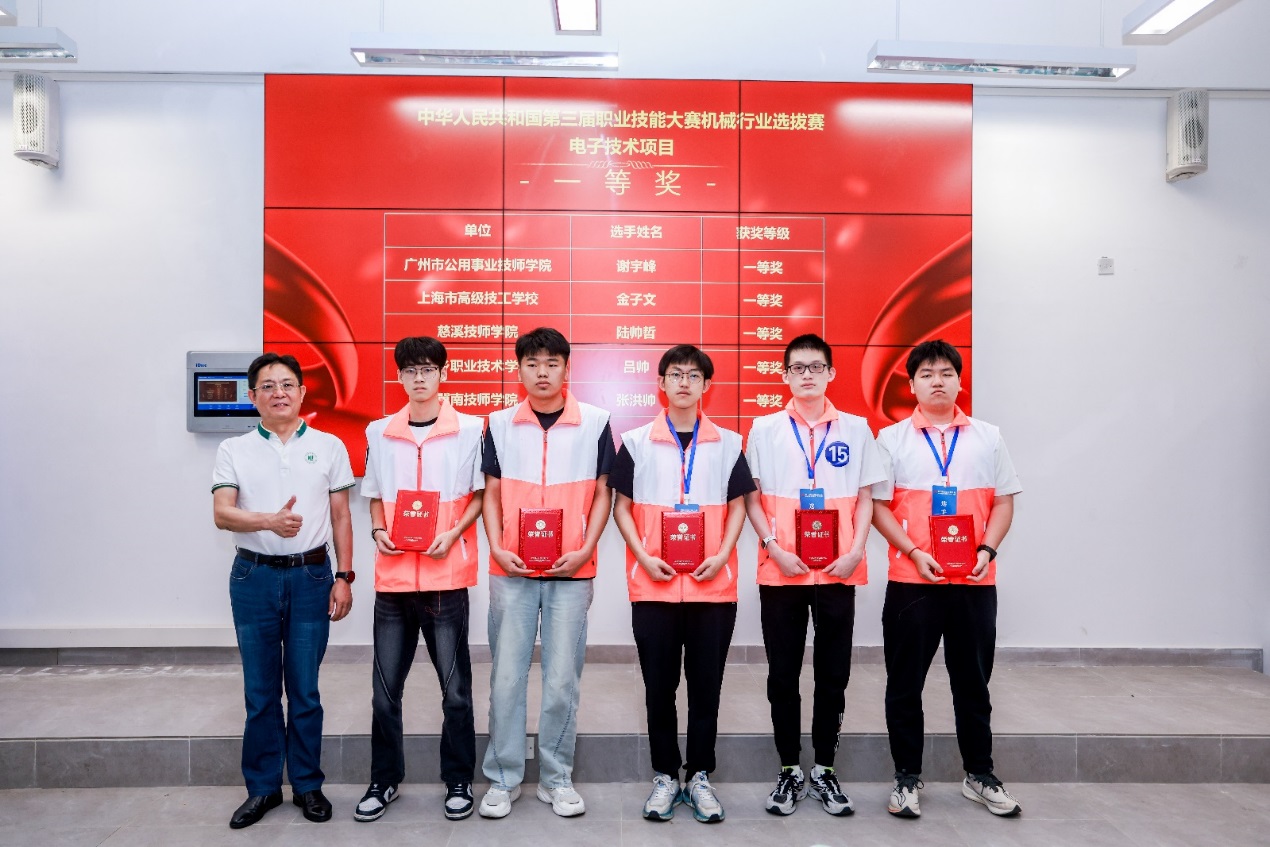 On June 11 to 12, 2025, the "Electronic Technology" event of the Mechanical Industry Selection for the 2025 National Vocational Skills Competition took place in Guangzhou. Sixteen elite competitors from twelve provinces and municipalities engaged in an intense 11-hour contest. Led by Department Director Zhang Rui, with core faculty mentors Zhang Jing and Xue Jinhui providing expert guidance, student Jin Ziwen delivered an outstanding performance to claim the prestigious First Prize.